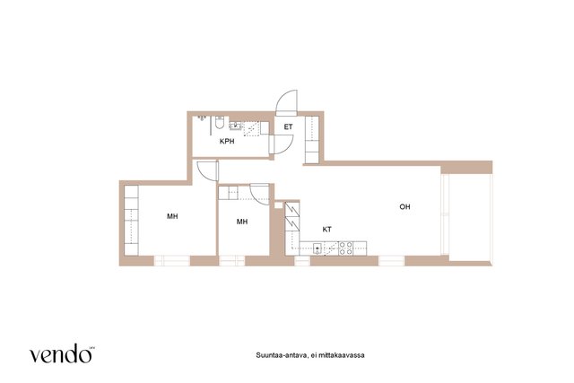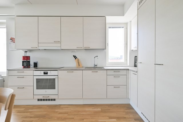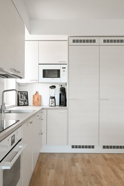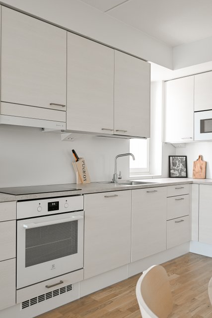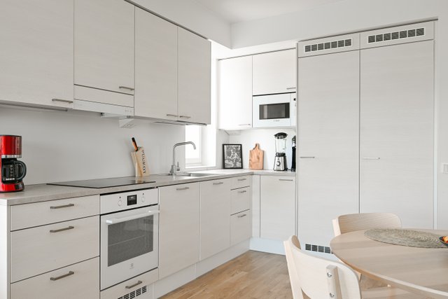 - Erillinen pakastin (kalustepeitteinen), jääkaappi (kalustepeitteinen), erillisuuni, liesi, astianpesukone (kalustepeitteinen), mikroaaltouuni, ja liesituuletin (integroitu)