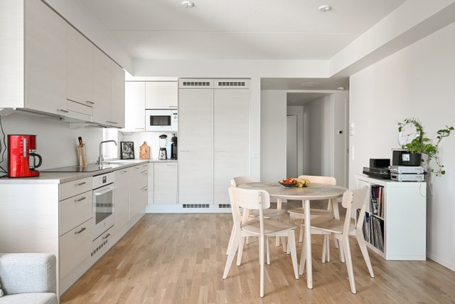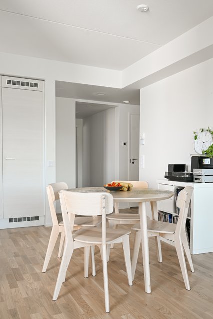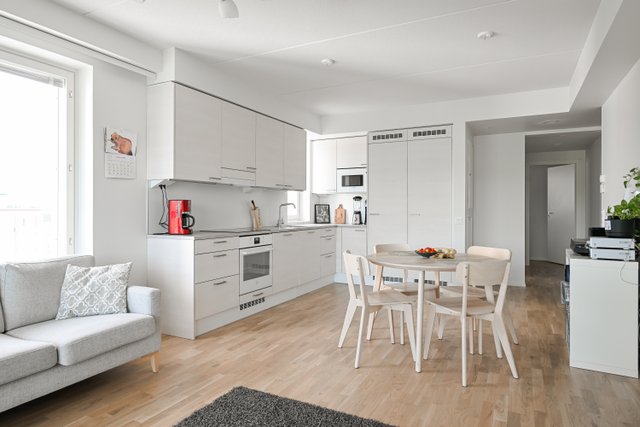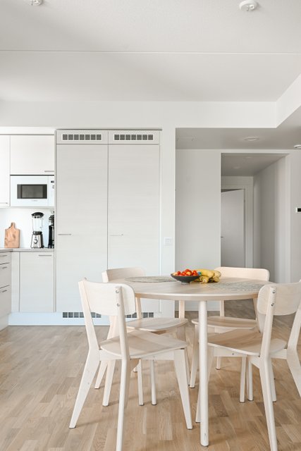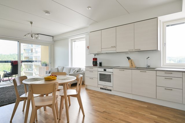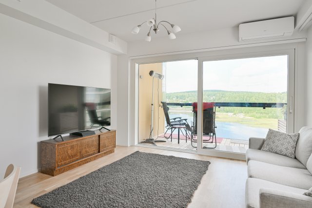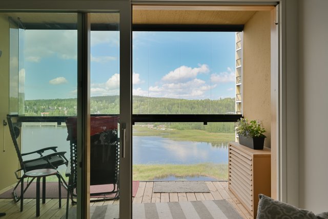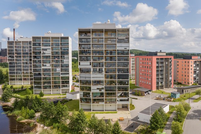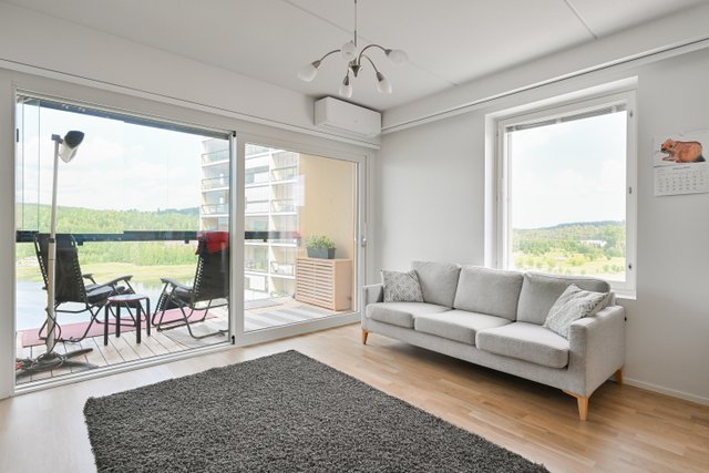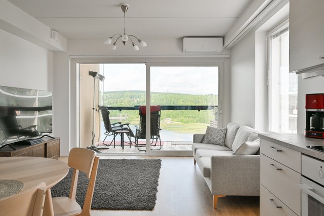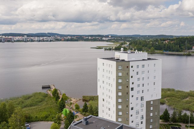 Valoisan kahden makuuhuoneen koti. Asunnon kaikissa tiloissa on miellyttävä vesikiertoinen lattialämmitys, pattereilta vapautuva tila antaa uusia sisustamisen ulottuvuuksia. Helteiden tullen painat ilmalämpöpumpun viilennysnappia ja nautit taas kotisi miellyttävästä lämpötilasta. Lasitetulle parvekkeelle johtavat lattiasta kattoon ulottuvat lasiliukuovet. Kotisohvaltasi katsot vuodenaikojen mukaan muuttuvaa Jyväsjärvi -näkymää.