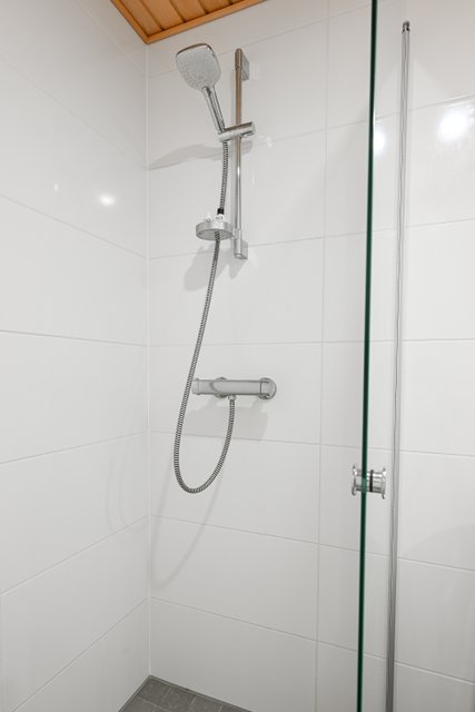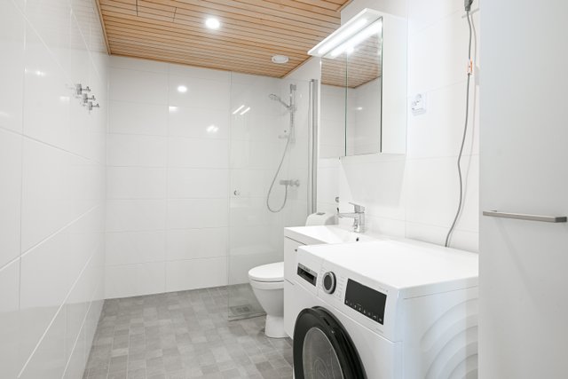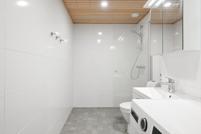 - WC-istuin, suihku, suihkuseinä, pesuallas, allaskaappi, bidee-suihku, lattialämmitys, pesukoneliitäntä, ja peilikaappi