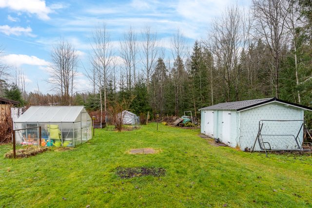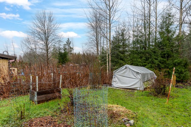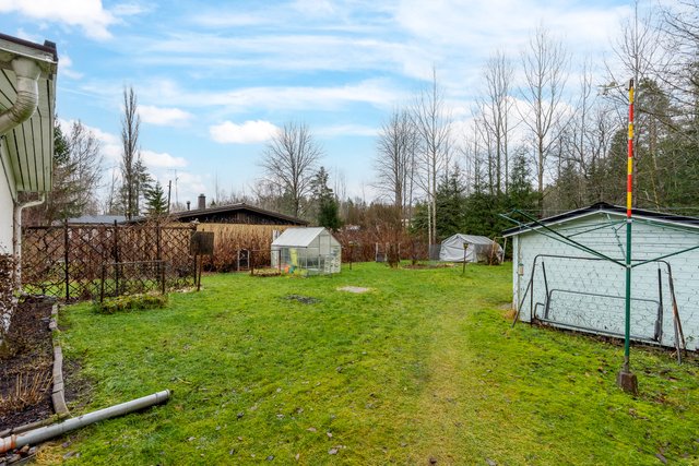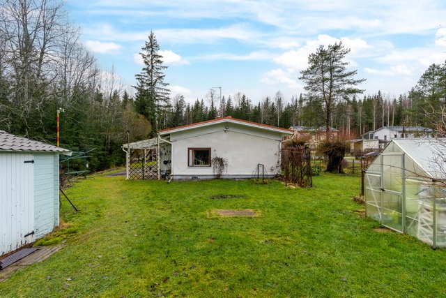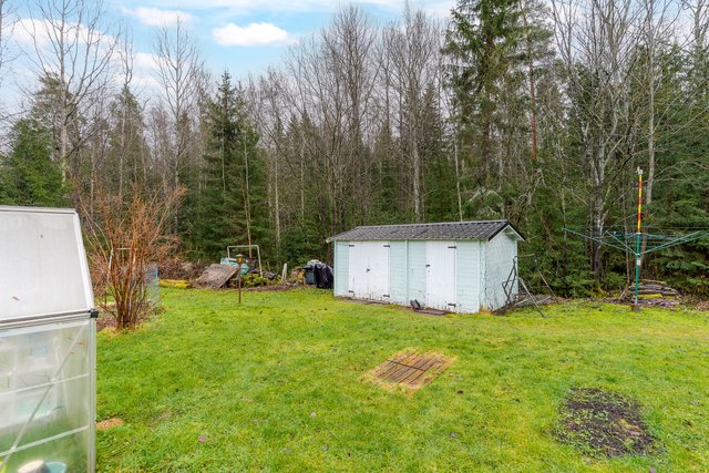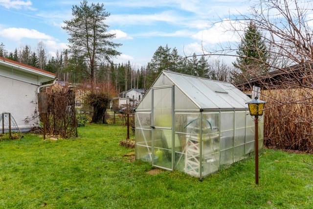 - Reilun kokoinen, tasainen nurmipiha, joka rajoittuu metsäalueeseen. Pihassa mm. vajarakennus ja kasvihuone.