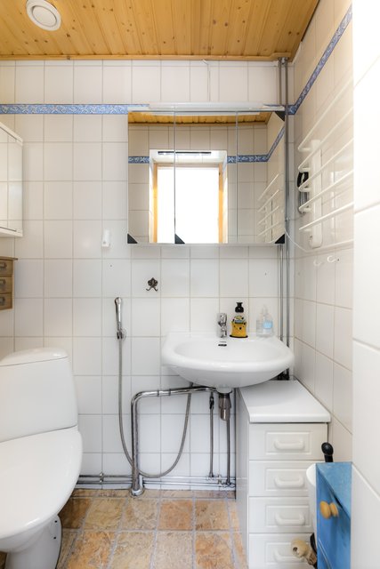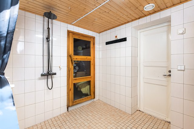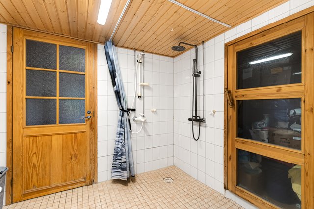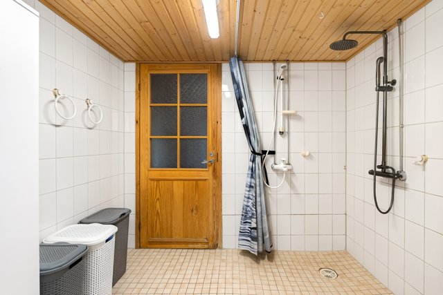 Kylpyhuoneessa on kaksi suihkua, joista toinen on sadesuihku, ja sauna, joka lämpiää sähkökiukaalla. Lisäksi erillinen WC ja kodinhoitotila tekevät arjesta sujuvaa. Teknisessä tilassa on säilytystilaa, ja lisäksi pihalla olevassa vajassa on lisää varastotilaa.