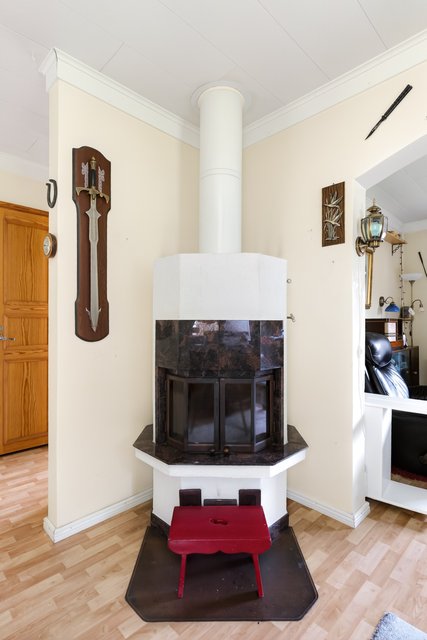 - Tilava olohuone, jota koristaa varaava takka. Olohuoneesta avautuu ikkunat kolmeen ilmansuuntaan. Seinät: maalattu Lattia: muovimatto