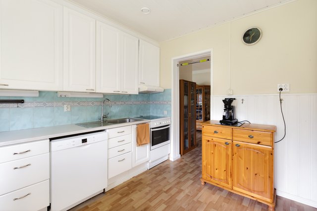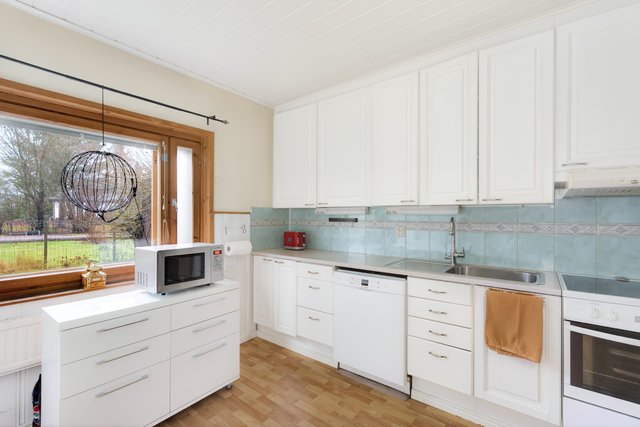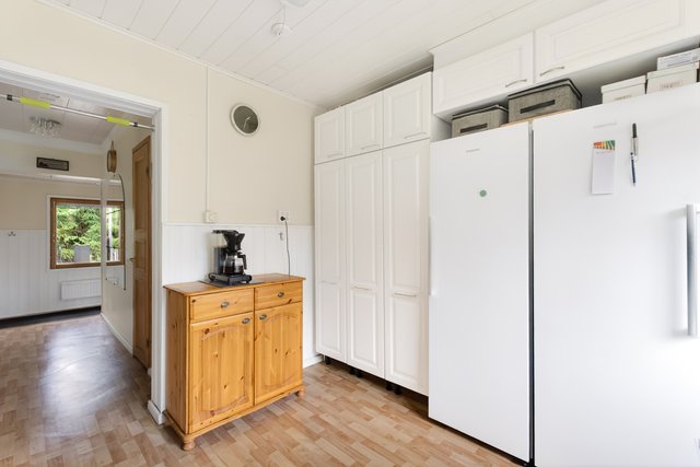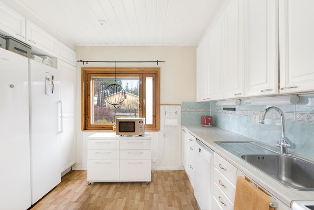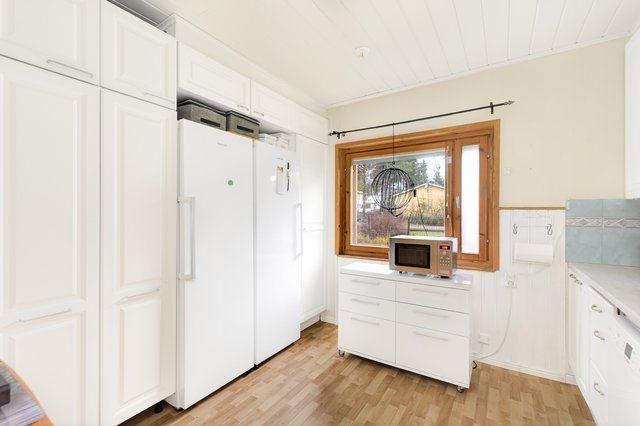 - Keittiön varusteisiin kuuluu: jääkaappi, pakastinkaappi, sähköliesi, liesituuletin, astianpesukone, kaapistot, kiinteät valaisimet Työtaso: laminaatti Välitila: kaakeli Seinät: puupaneeli/ maalattu Lattia: muovimatto