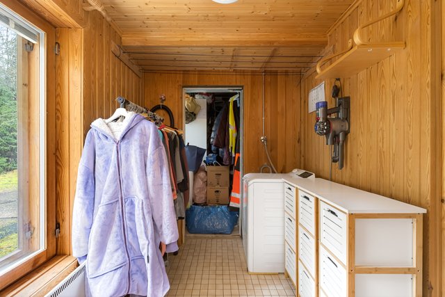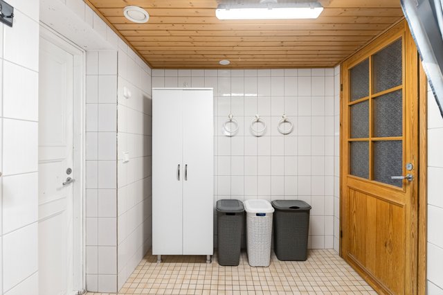 - Pesuhuoneen ulkopuolella on pukeutumistila, jota on käytetty kodinhoitohuoneena. Tilassa pesukoneliitäntä. Seinät: puu Lattia: laatta