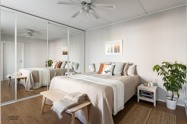 - Iso valoisa makuuhuone. Koko seinän liukuovikaapistot teetetty tilaustyönä.