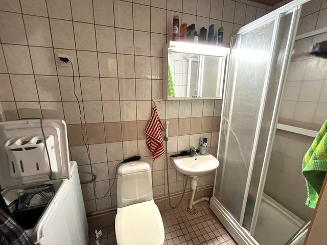 - WC-istuin, suihku, pesukoneliitäntä, peilikaappi, pesuallas, bidee-suihku, ja suihkukaappi
