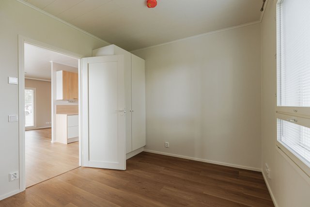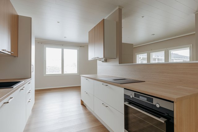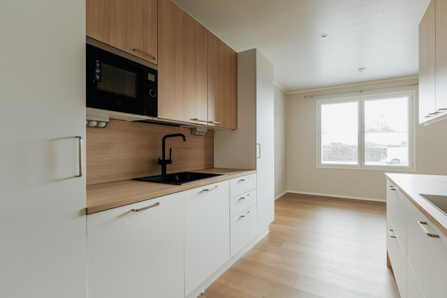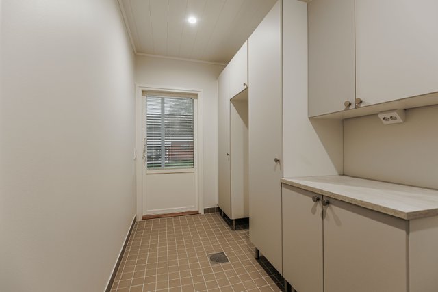 - Pesukoneliitäntä, pyykkikaapit, tila pesutornille, lattialämmitys, ja pöytätaso
