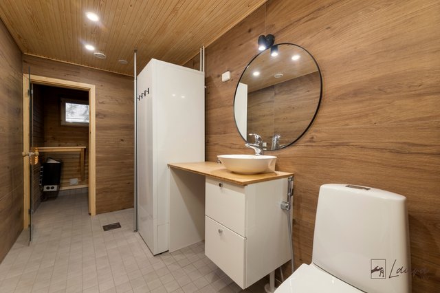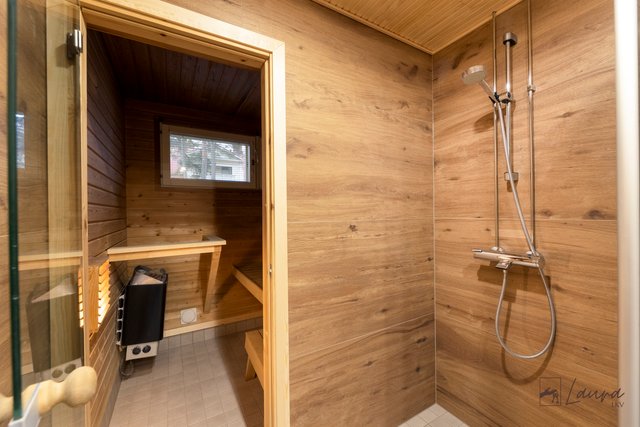 - WC-istuin, pesukoneliitäntä, lattialämmitys, lämminvesivaraaja, bidee-suihku, peili, ja suihkuseinä