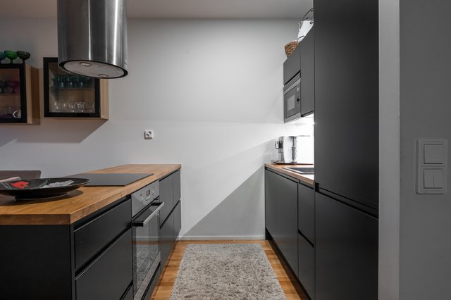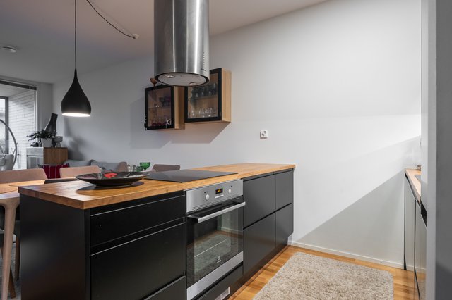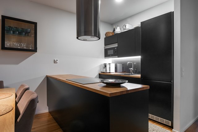- Tyylikäs avokeittiö saarekkeella, puiset työtasot, integroidut kodinkoneet