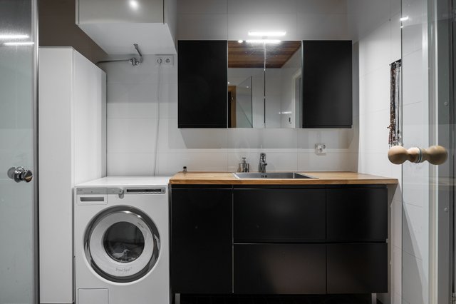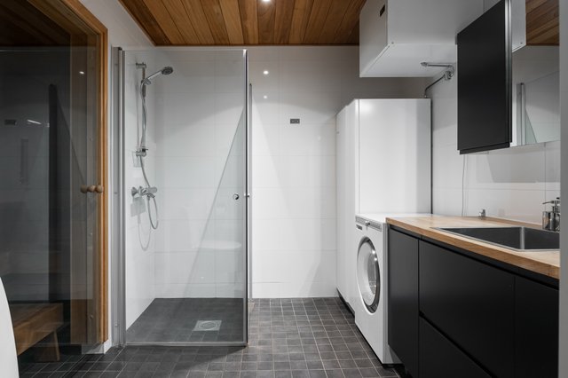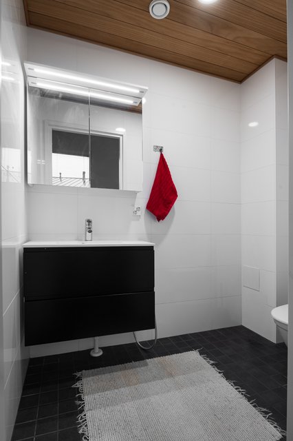 - WC-istuin, suihku, suihkuseinä, lattialämmitys, peilikaappi, pesuallas, allaskaappi, ja bidee-suihku
