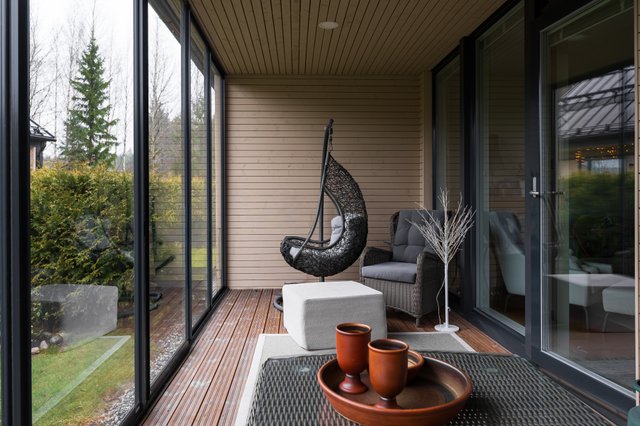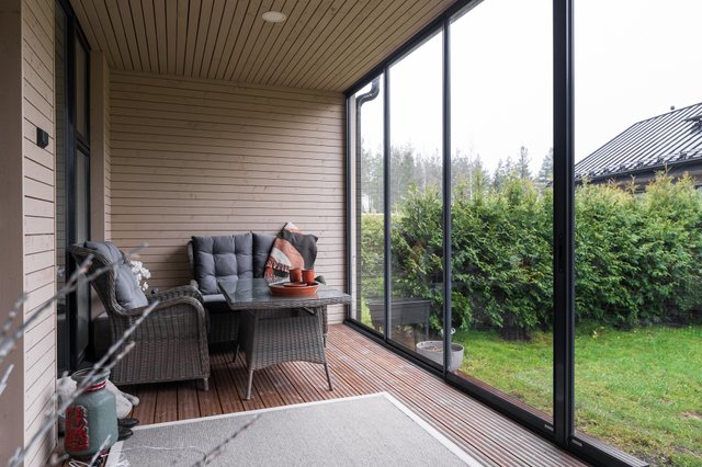 - Koko asunnonlevyinen iso lasitettu terassi.