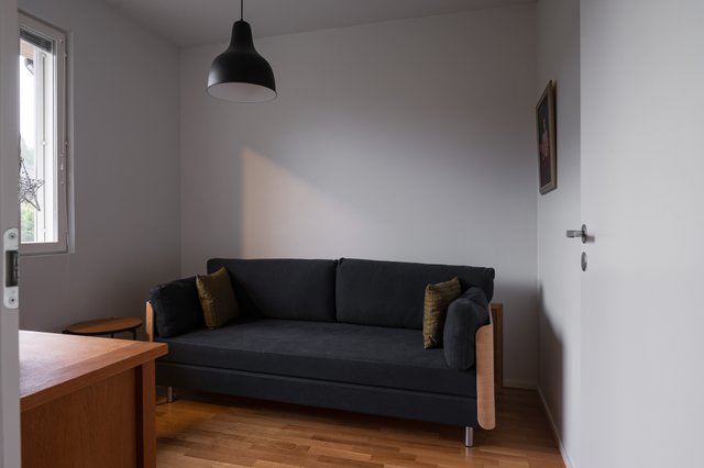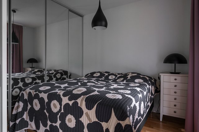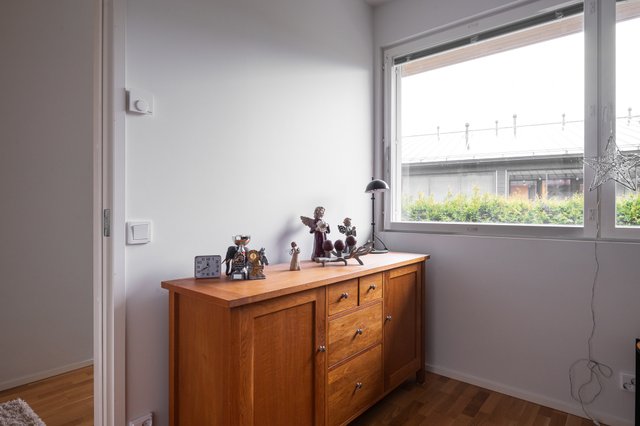 Kodin makuuhuoneet sijoittuvat fiksusti eri puolille asuntoa, mikä tekee pohjaratkaisusta joustavan ja sopivan moneen elämäntilanteeseen. Terassin puoleisessa makuuhuoneessa oleva liukuovi olohuoneeseen tuo tilaan monikäyttöisyyttä ja mahdollisuuksia. Kiinteät peililiukuovikaapistot tarjoavat säilytystilaa ilman, että huoneen avaruus kärsii. Kylpyhuone- ja saunayhdistelmä on osa kodin eheää kokonaisuutta – selkeä, toimiva ja tyylikäs. Eteisen yhteydestä löytyy erillinen toinen WC.