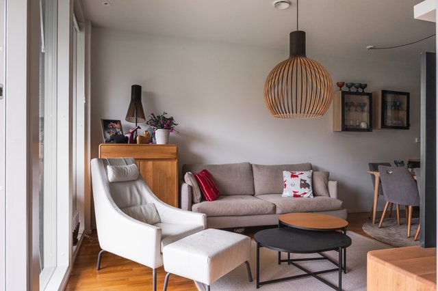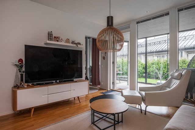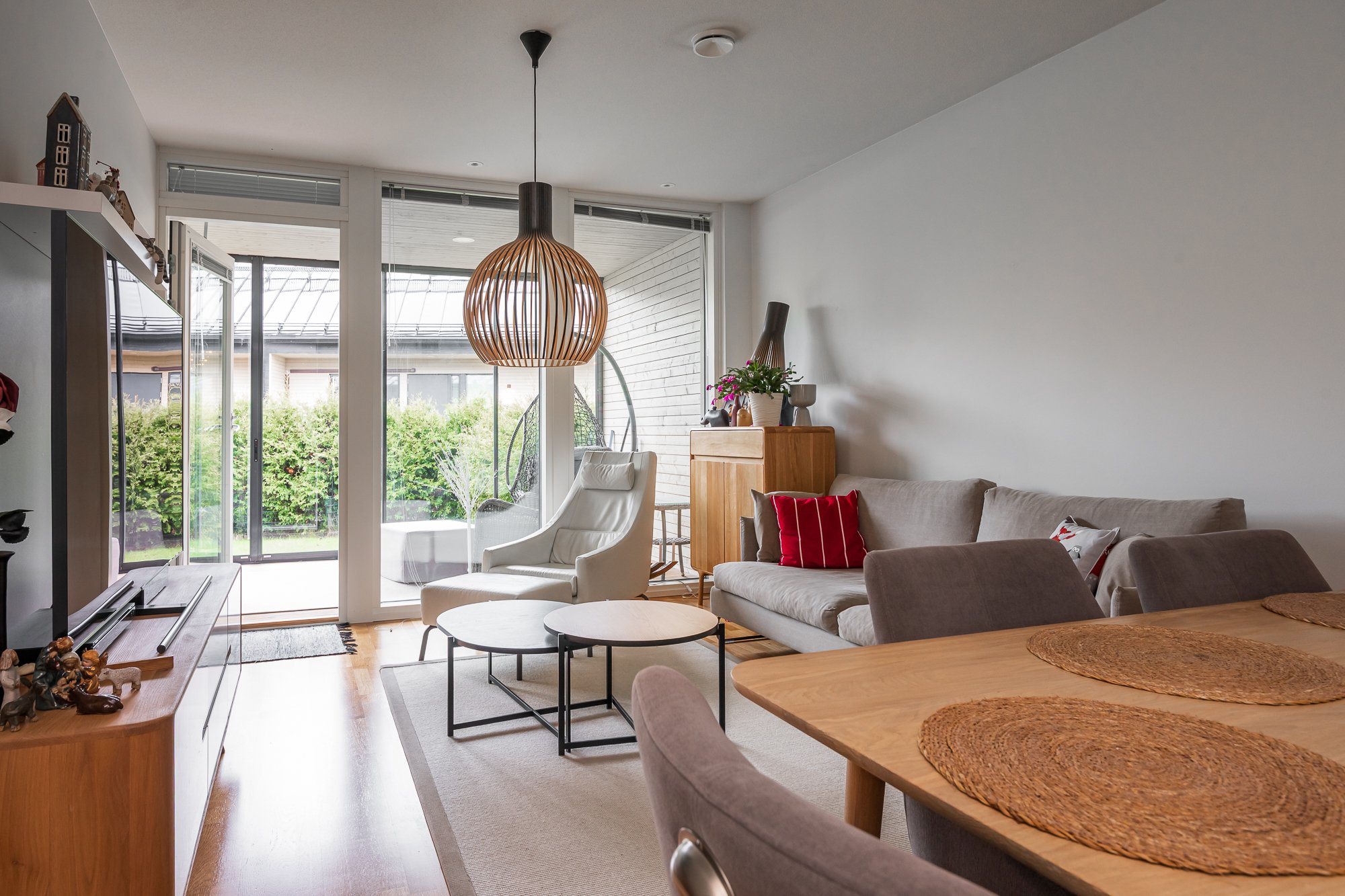 Kodin sydän on kaunis olohuone- ja keittiöyhdistelmä, jossa eri toiminnoille on varattu riittävästi tilaa. Keittiö on suunniteltu sekä käytännölliseksi että viihtyisäksi. Saarekkeen ympärille mahtuu useampikin kokki ja integroidut kodinkoneet sekä puiset työtasot varmistavat tyylikkään eleganssin. Valo täyttää tilan päivän eri hetkinä ja johdattaa katseen suoraan koko asunnon levyiselle lasitetulle terassille. Terassi on tässä kodissa todellinen bonushuone – paikka, jossa voi hengähtää, rentoutua tai vaikka tehdä etätöitä nauttien rauhallisesta tunnelmasta ympäröivän vihreyden keskellä. Takapihan nurmialue ja tuuhea tuija-aita tuovat pihaan oman rauhan.