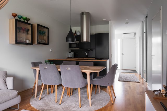- Jääkaappipakastin, liesituuletin, mikroaaltouuni, astianpesukone, keittiösaareke, erillisuuni, ja liesi