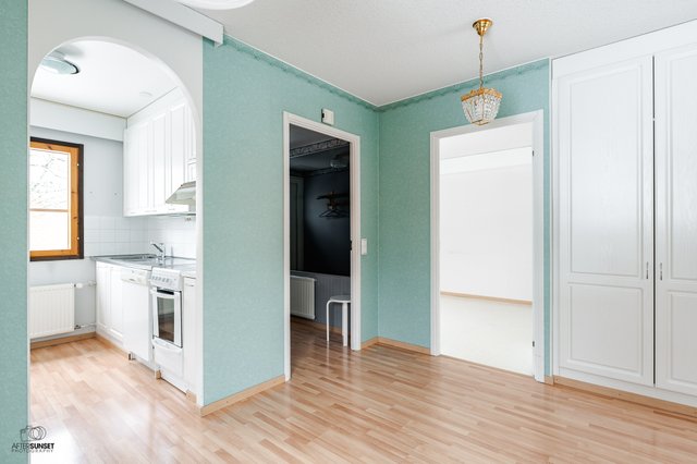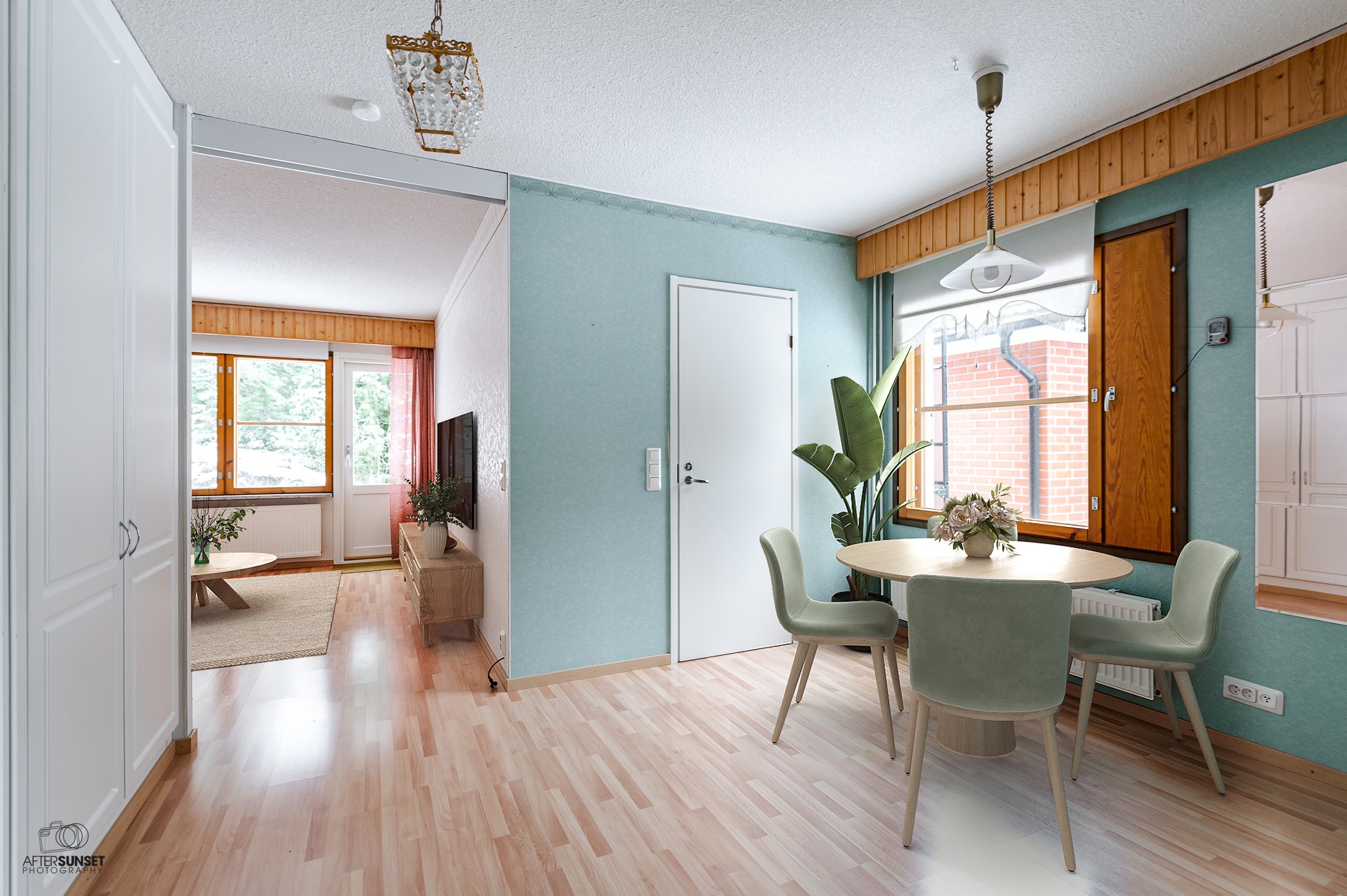 Tilava rivitalon pääty kaksio. Asunnossa on hyvin säilytystilaa. Etupihalla on varasto, ja makuuhuoneen yhteydessä tilava vaatehuone. Massasta poikkeavasta pohjaratkaisussa löytyy oma ruokailuhuone. Asunnosta löytyy myös tilava kylpyhuone ja oma sauna. Asunnon sydän on valoisa olohuone, josta avautuu näkymä omalle pienelle pihalle – täydellinen paikka nauttia aamukahvista tai rentoutua päivän päätteeksi. Remontoi tästä mieleisesi koti!