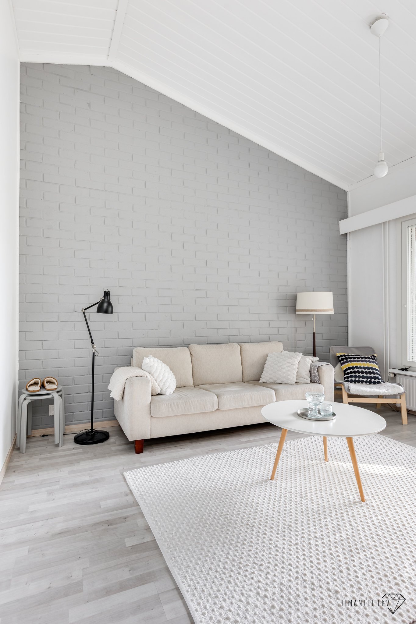 - Valoisa ja ihastuttava olohuone, jossa katseenvangitsijana upea tiiliseinä sekä korotettu viistokatto tuomassa tilaan tunnelmaa. Olohuoneen kautta kulku myös kodin kauniille terassille sekä takapihalle.