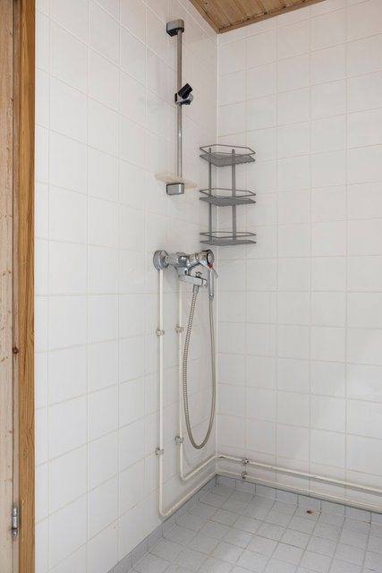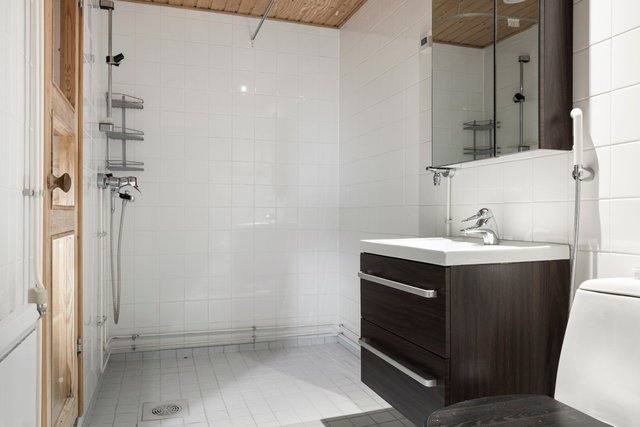 - WC-istuin, suihku, pesukoneliitäntä, peilikaappi, pesuallas, allaskaappi, ja bidee-suihku