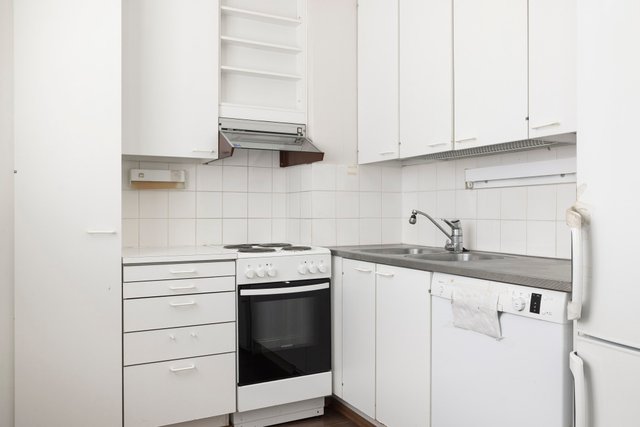 - Jääkaappipakastin, astianpesukone (Epäkunnossa), liesi, uuni, ja liesituuletin