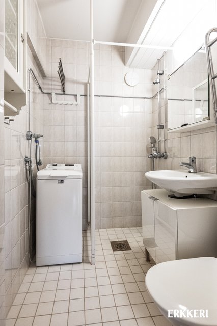 - WC-istuin, pesukoneliitäntä, suihkuseinä, pesuallas, allaskaappi, peilikaappi, ja sadesuihku