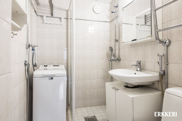 - Kylpyhuone vuodelta 2003 (kalusteet uusittu 2025).