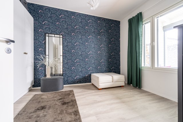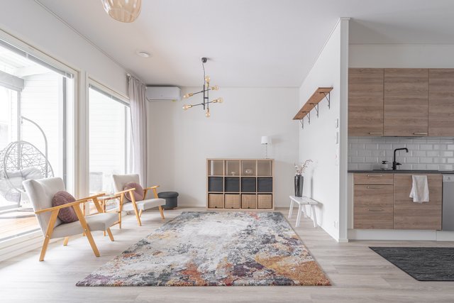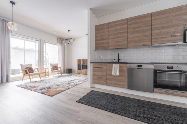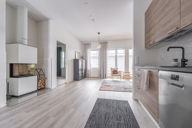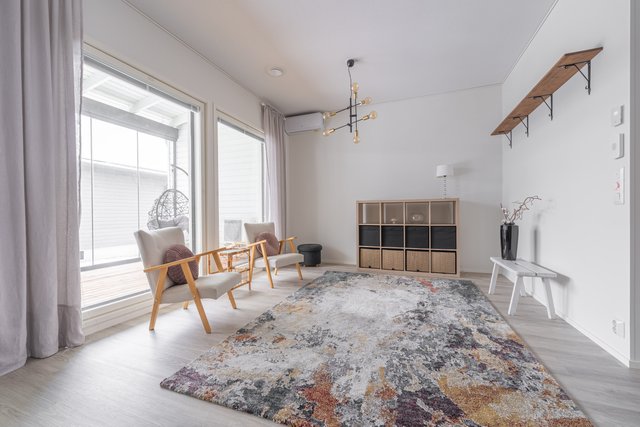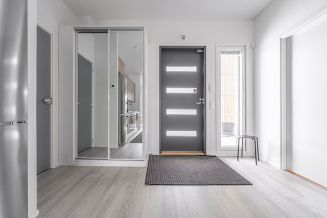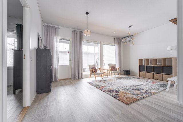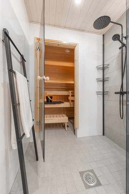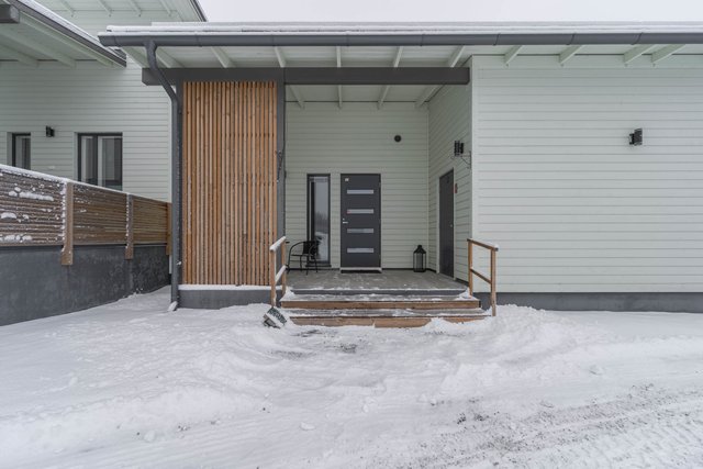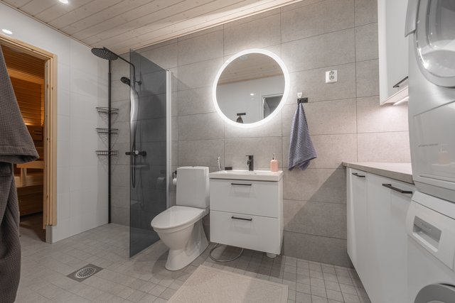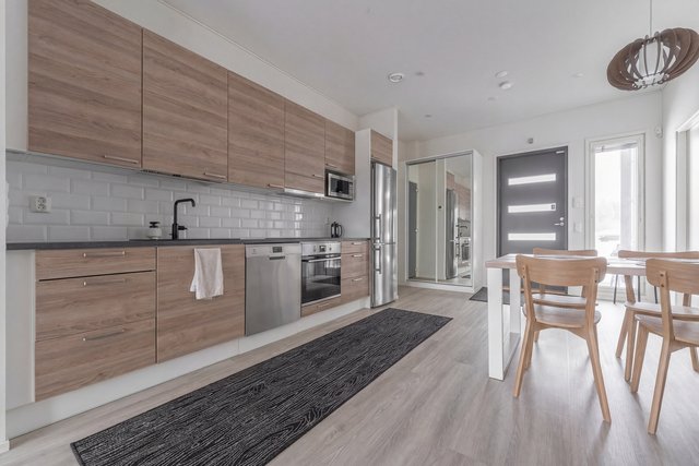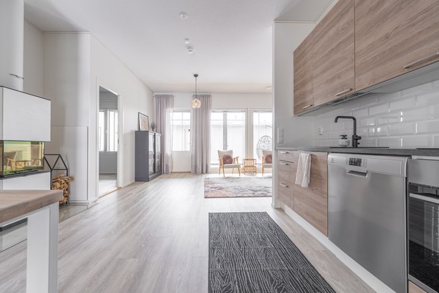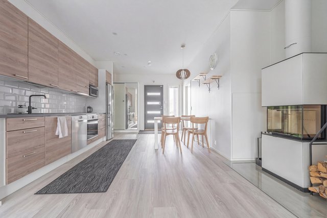 Tämä kaikilla herkuilla varustettu koti on lähes uutta vastaavassa kunnossa. Kodin pinnat ovat paitsi tyylikkäät myös käytännölliset. Lattiassa on kaunis vinyylilankku ja seinäpinnat ovat pääosin vaaleat. Keittiö on kotoisa ja laskutilaa löytyy mukavasti. Tilava kylpyhuone on silmiä hivelevän kaunis, jota koristaa mustat hana ja suihku, sekä upea valopeili. Kodinhoitonurkkaus kylpyhuoneen yhteydessä helpottaa pyykkihuoltoa. Oman saunan löylyissä voit puolestaan viipyillä kaikessa rauhassa.