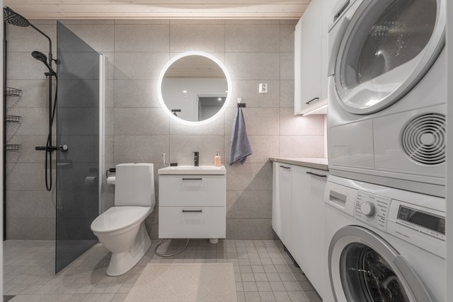 - WC-istuin, suihku, suihkuseinä, pesukoneliitäntä, allaskaappi, peili, pesukone (saa jäädä), ja kuivausrumpu (saa jäädä)