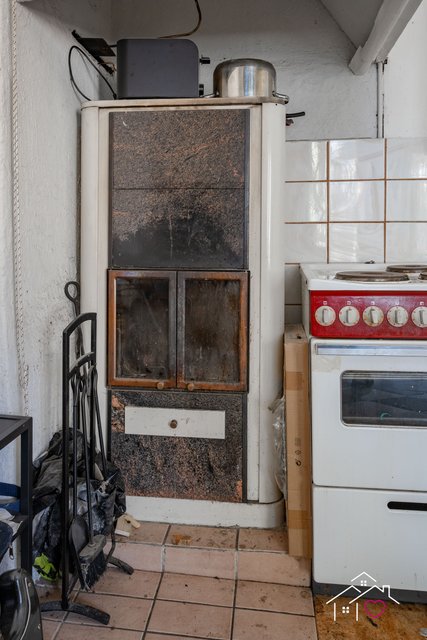 - Hellahuoneessa on Slevin sähköliesi, puu-uuni, huuva, 2 allasta, hana, taso, valaisin yläkaapin alla. Zanussin jääkaappi pakastelokerolla on hellahuoneessa ikkunan vieressä. Lattia on muovimattoa ja seinät on lasikuitutapettia. Välitila on laatoitettu.