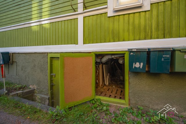 - Eteinen: lattia on muovimattoa ja seinät on maalattu. Eteisessä on naulakko. Portaikosta kulku yläkerran varastotilaan. Yhtiöjärjestyksessä mainittu varastotila on talon alapuolella kellarikerroksessa. Kellariin on kulku ulkokautta.