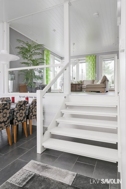 Toimiva ja valoisa pohjaratkaisu, joka on toteutettu porrastetusti. Sisääntulon tasolla on kolme makuhuonetta, tilava kodinhoitotila sekä keittiö. Ylemmällä tasolla iso olohuone, makuuhuone, saunaosasto sekä terassit.