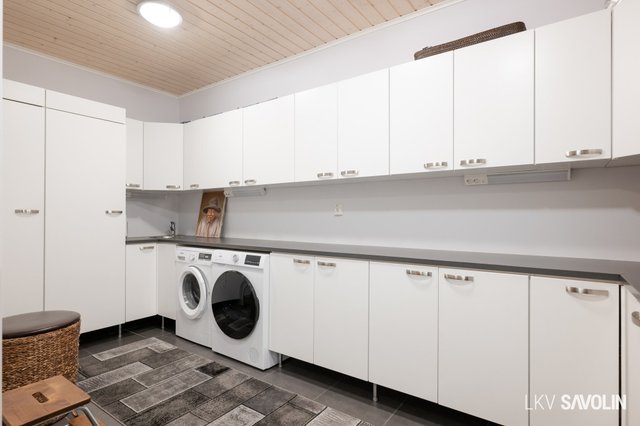 - Pesukoneliitäntä, lattialämmitys, pesuallas, pyykkikaapit, kurapiste, ja pöytätaso