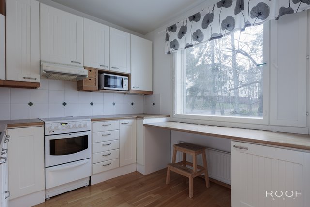 Reilun kokoinen kylpyhuone on remontoitu yhtiön toimesta. Asunnon lasitettu parveke tuo lisätilaa ja mahdollisuuden nauttia ulkoilmasta ympäri vuoden.
