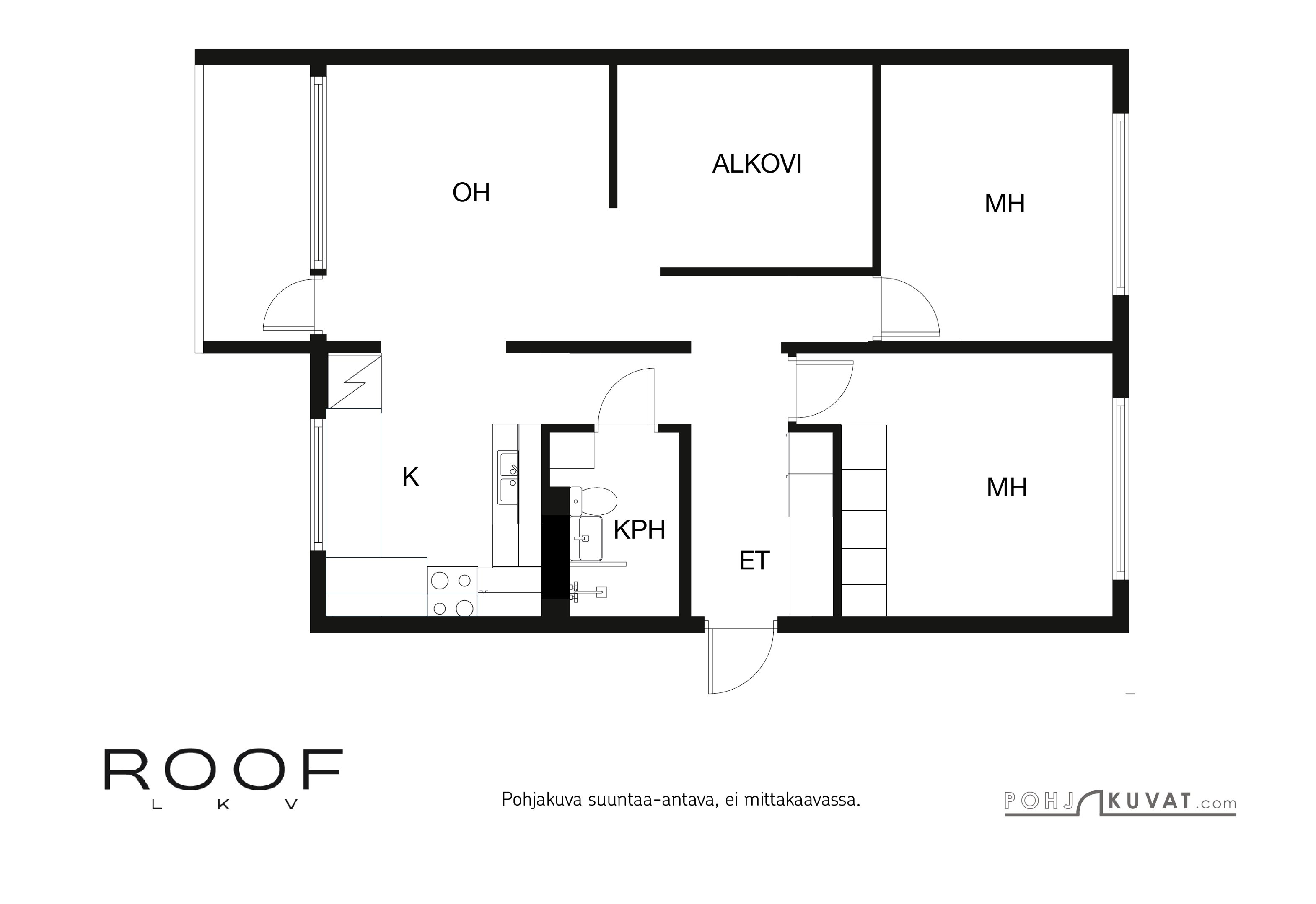 - Olohuoneen ja toisen makuuhuoneen väliin on rakennettu alkovi.