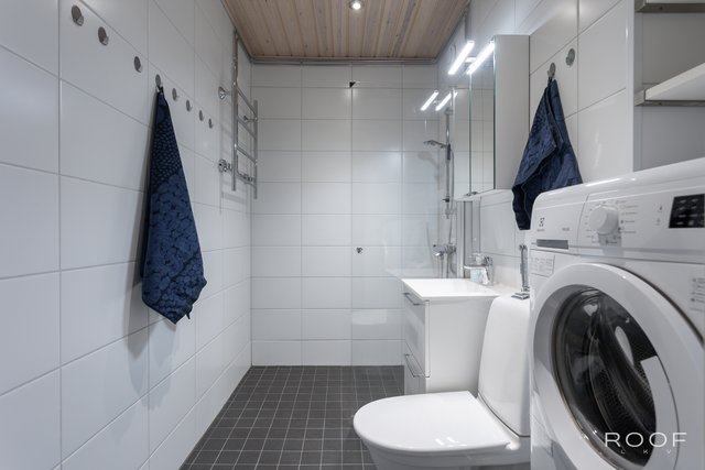 - WC-istuin, suihkuseinä, suihku, pesukoneliitäntä, allaskaappi, bidee-suihku, peilikaappi, kuivauspatteri, kattopanelointi, ja lattialämmitys