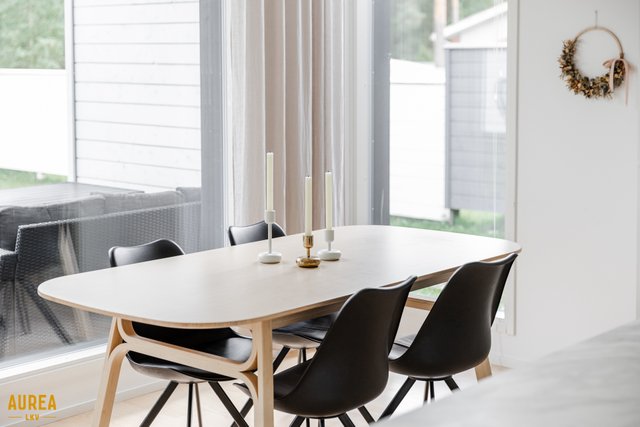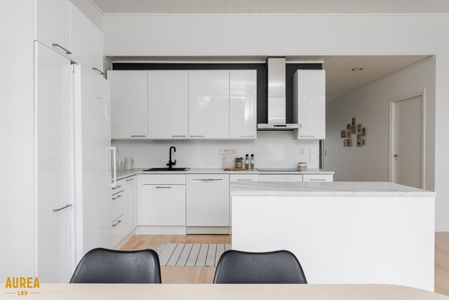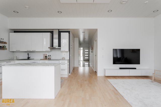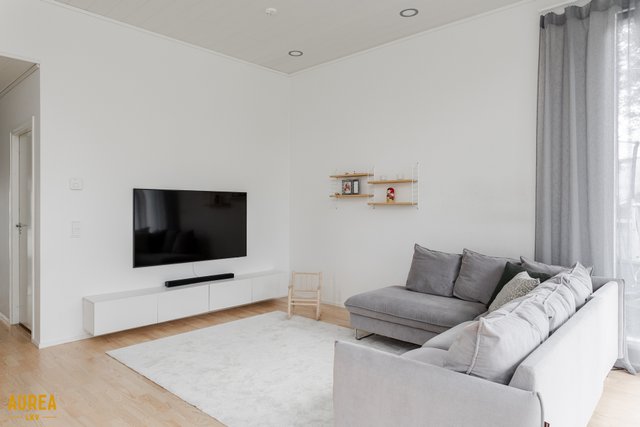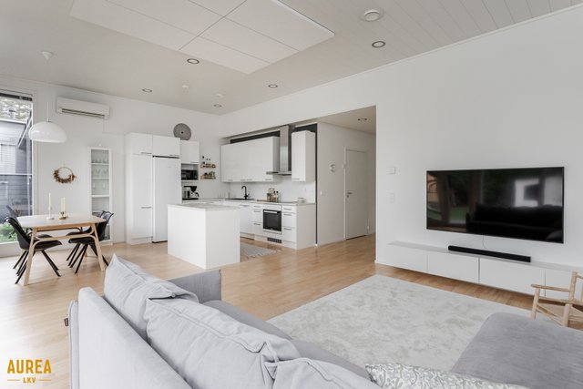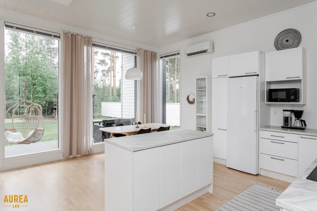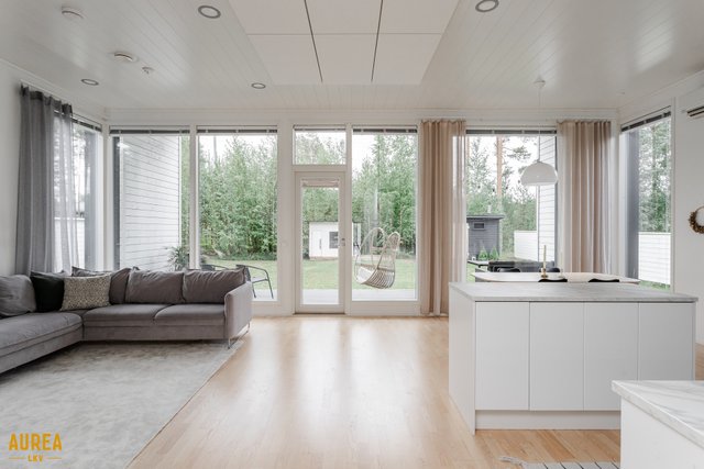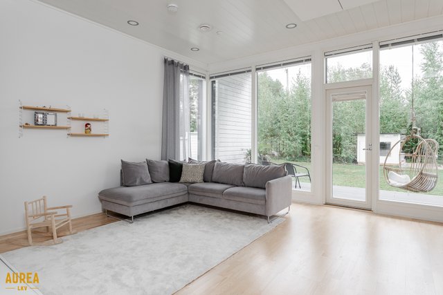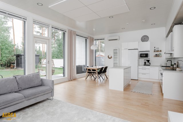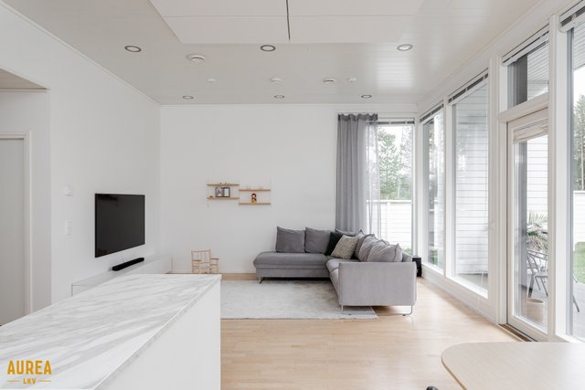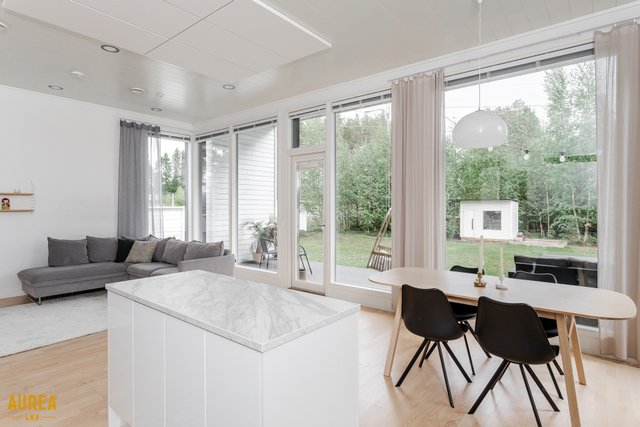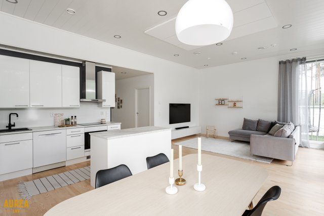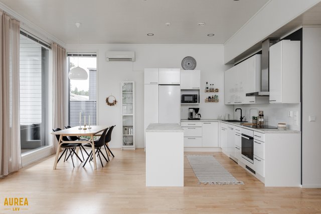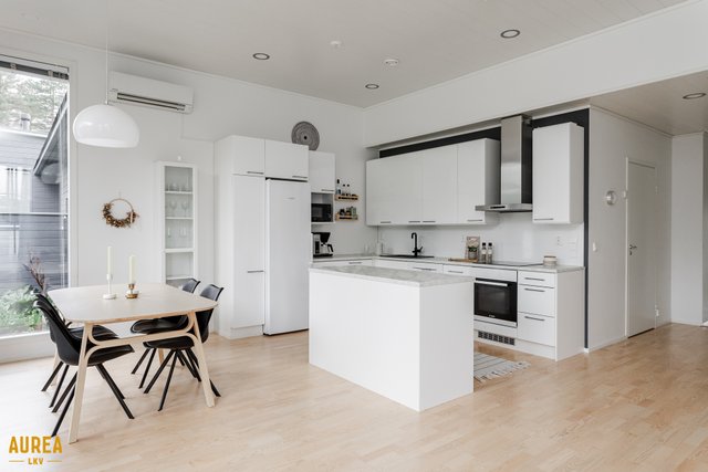Avara olohuone hurmaa korkealla huonekorkeudellaan ja suurilla ikkunoillaan. Tyylikäs saarekkeellinen kulmakeittiö laadukkailla kodinkoneilla tekee ruoanlaitosta nautinnon. Kolme makuuhuonetta on sijoiteltu tarjoamaan omaa rauhaa jokaiselle. Tilava kodinhoitohuone omalla sisäänkäynnillä helpottaa arkea, ja tyylikkään kylpyhuoneen kruunaa ikkunallinen sauna. Lisäksi eteisen yhteydessä on erillinen wc.