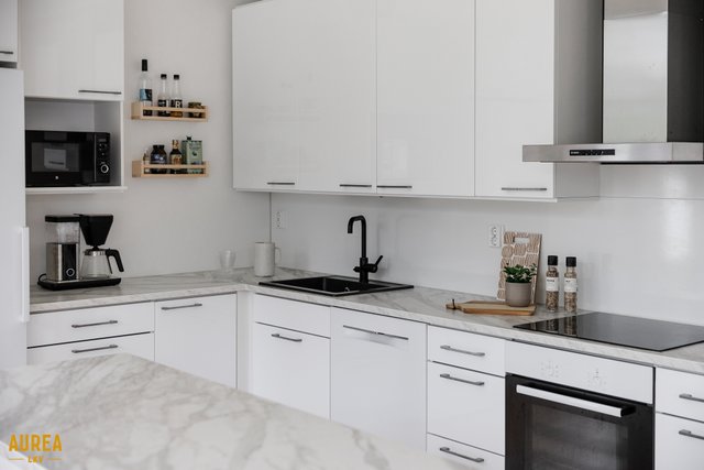 - Valkoinen saarekkeellinen Charmia keittiö. Tasot, allas ja hana uusittu -22, saareke asennettu -22. (Arkkupakastin lämpimässä varastossa.)