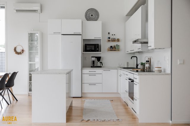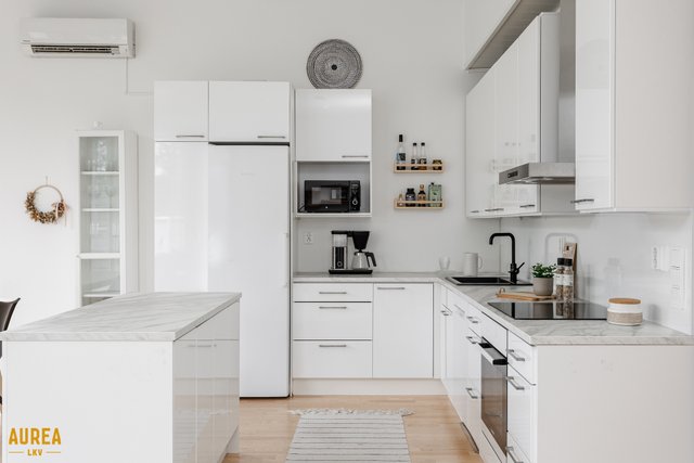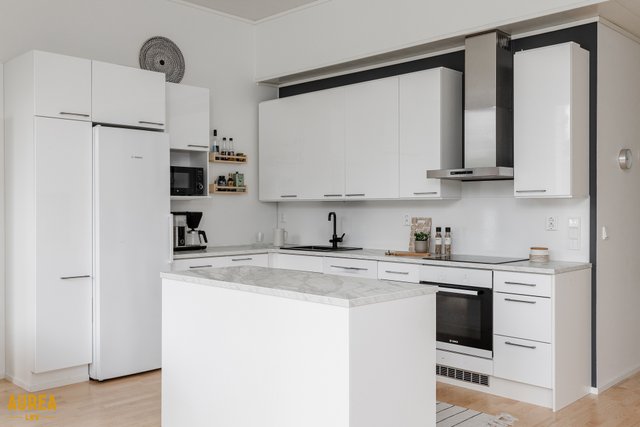 - Jääkaappi, astianpesukone, liesi, liesituuletin, erillisuuni, ja keittiösaareke