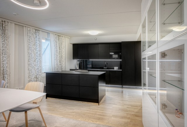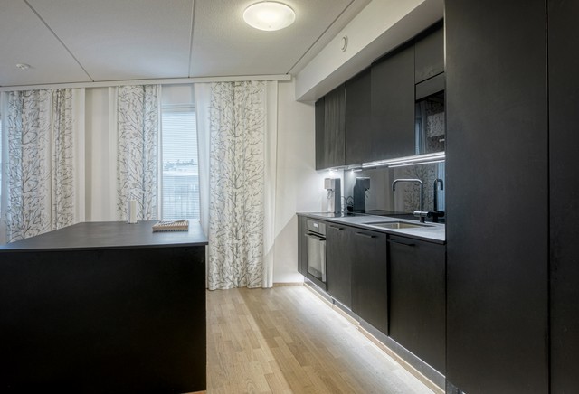 - Jääkaappi, erillinen pakastin, uuni, liesi (Uusittu 2024), liesituuletin, mikroaaltouuni, astianpesukone (Uusittu 2024), ja keittiösaareke