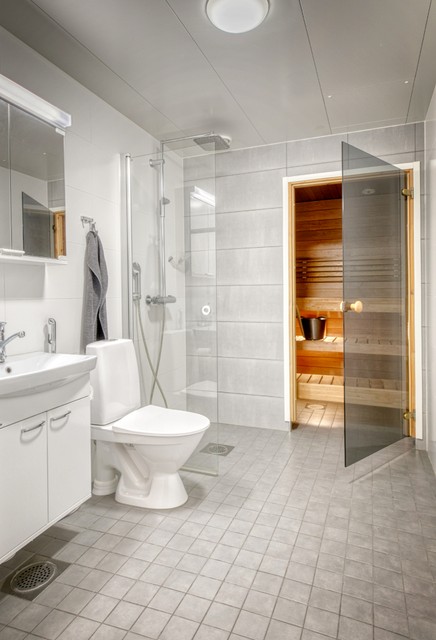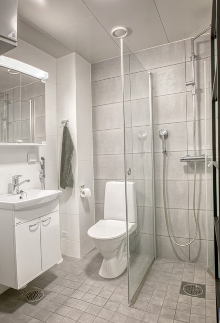 - WC-istuin, suihkuseinä, lattialämmitys, peilikaappi, pesuallas, allaskaappi, ja bidee-suihku