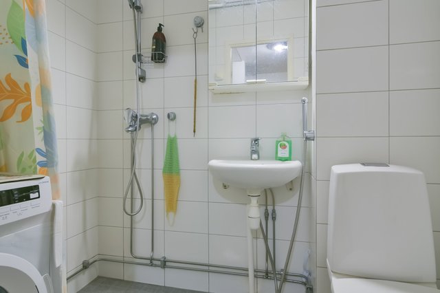 - WC-istuin, suihku, pesukoneliitäntä, bidee-suihku, peilikaappi, ja pesuallas