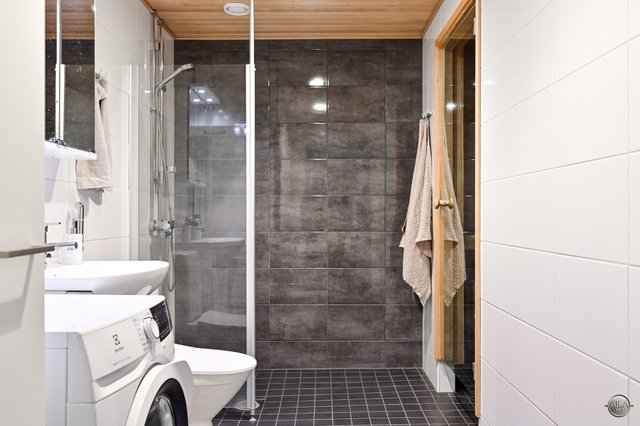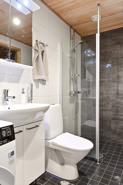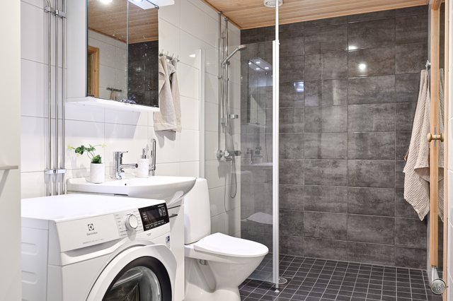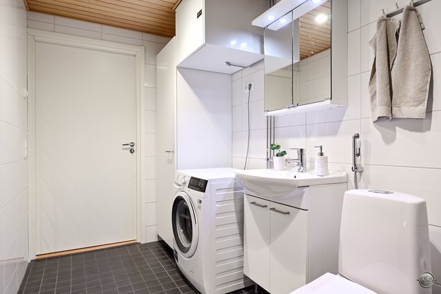 - WC-istuin, suihku, suihkuseinä, lattialämmitys, pesukoneliitäntä, allaskaappi, ja peilikaappi