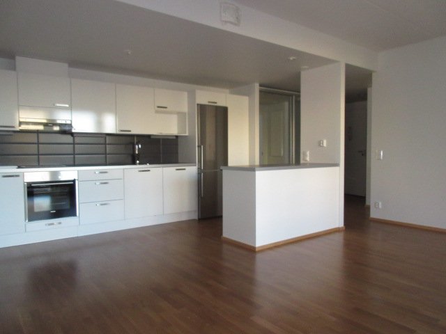 Avokeittiö ja olohuone muodostavat viihtyisän kokonaisuuden, jossa on helppoa kokkailla ja viettää aikaa. Suuret ikkunat tuovat runsaasti luonnonvaloa läpi päivän ja lasitettu parveke tarjoaa oman ulko-oleskelutilan pitkälle syksyyn asti.