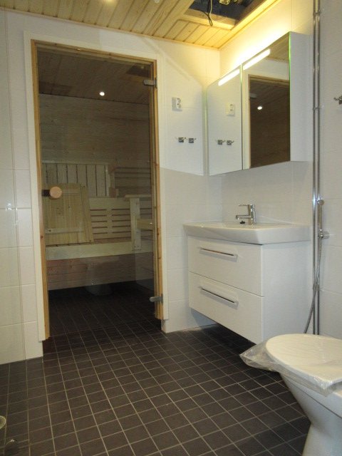 - WC-istuin, suihku, suihkuseinä, pesukoneliitäntä, peilikaappi, allaskaappi, ja bidee-suihku