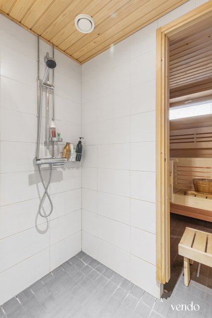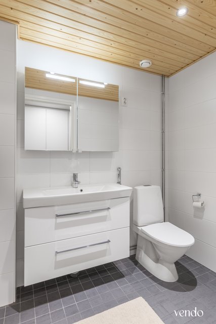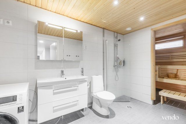 - WC-istuin, suihkuseinä, pesukoneliitäntä, bidee-suihku, peilikaappi, ja allaskaappi