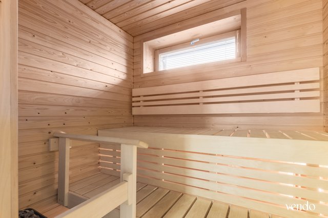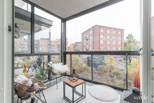 Avarasta olohuoneesta on käynti lasitetulle rauhallisen sisäpihan suuntaan avautuvalle parvekkeelle. Tyylikäs kylpyhuone ja oma sauna viimeistelevät kokonaisuuden.
