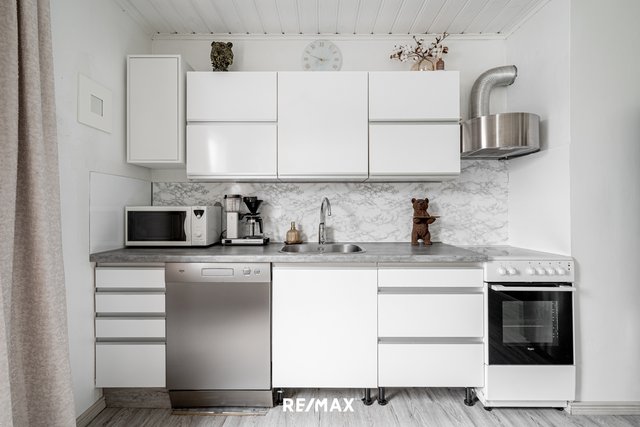 Asunnon sydän on avara keittiö-/olohuoneyhdistelmä, jossa on reilusti tilaa niin arjen oleskelulle kuin yhteisille hetkille. Reilunkokoiset ikkunat tuovat tilaan runsaasti luonnonvaloa, ja olohuoneen liukuovi johdattaa suoraan takapihan terassille – täydellinen paikka kesäilloille ja rauhallisille aamuhetkille.