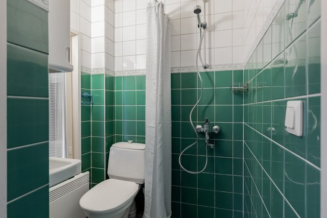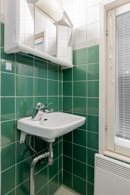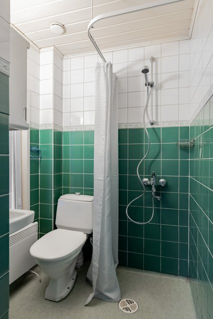 - WC-istuin, suihku, suihkuseinä, pesukoneliitäntä, pesuallas, ja peilikaappi