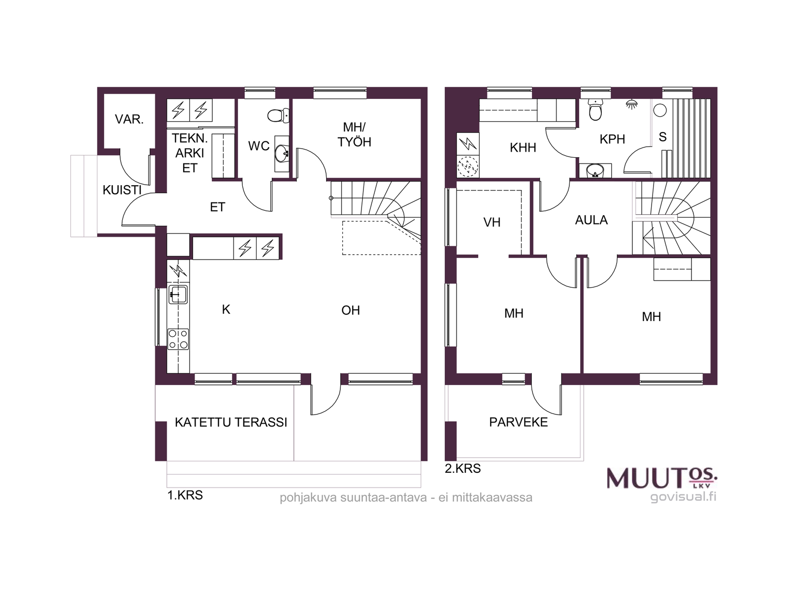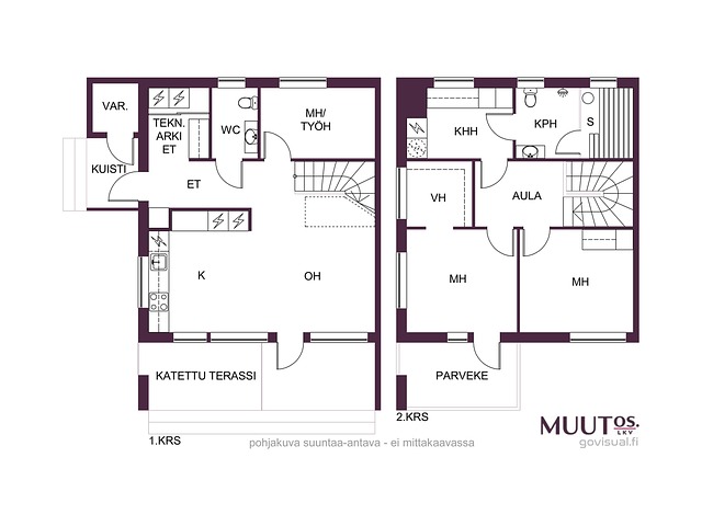 - Pinta-alat perustuvat myyjältä saatuihin tietoihin ja rakennuspiirustuksista laskettuihin arvioihin. Pinta-aloja ei ole tarkistusmitattu, mitattaessa pinta-alat saattavat olla ilmoitettua suurempia tai pienempiä. Hinta ei ole pinta-alaperusteinen. Rakennuspiirustusten mukainen huoneiston B huoneistoala on 93 m2, kerrosala 113 m2 ja kerrosala (250 mm) 109 m2. Koko rakennuksen huoneistoala 186 m2, kerrosala 226 m2 ja kerrosala (250 mm) 218 m2. Asuintilojen pinta-ala on laskettu rakennuspiirustuksista ja siihen on huomioitu kaikki asuinkäytössä olevat tilat, muihin tiloihin on laskettu varasto ja tekninen tila.