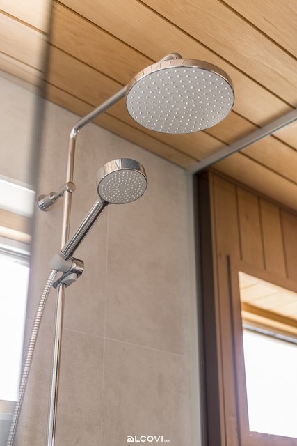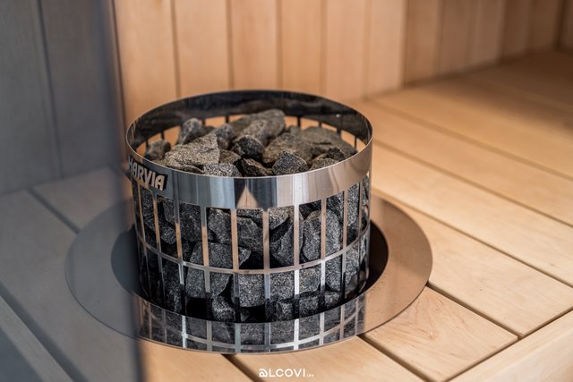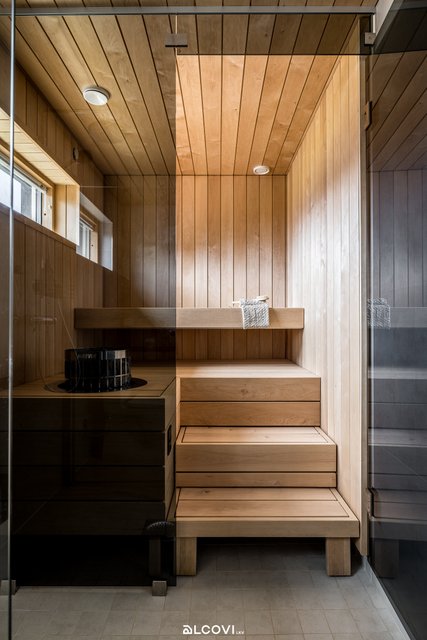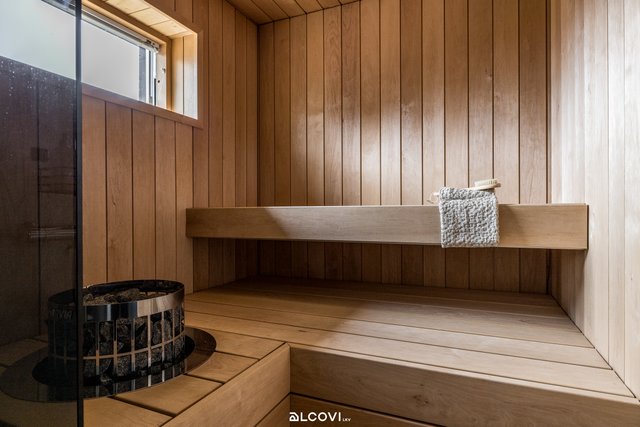 - Harvia Cilindro-pylväskiuas, sähkö, upotettu lauteisiin. Kiukaalle Xenio-ohjauspaneeli. Lauteet tervaleppää. Lattia on laattaa (Betontech 10x10, White Rect), seinät ja katto paneloitu (tervaleppä). Ikkuna ulos. Lattialämmitys (vesikiertoinen).