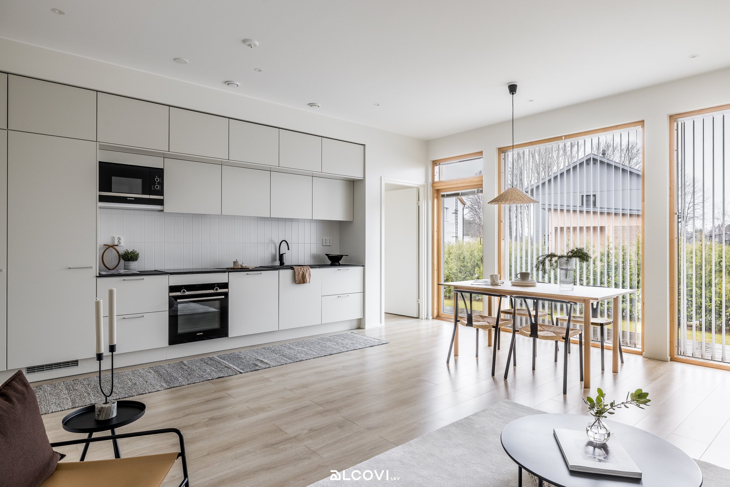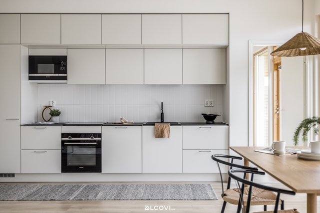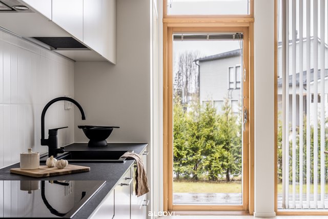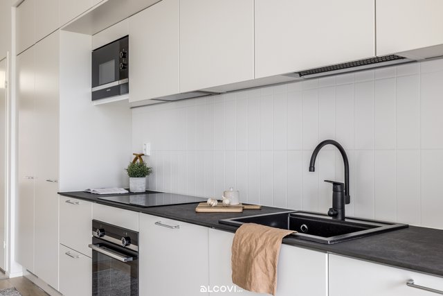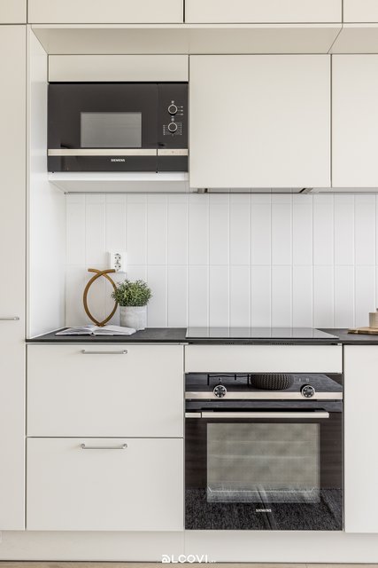 - Avokeittiön (Ilona-keittiöt) varustukseen kuuluvat Siemens-merkkiset integroidut kodinkoneet: induktioliesitaso, liesituuletin, kalusteuuni, mikroaaltouuni, astianpesukone, jääkaappi ja pakastin. Työtaso on kompaktilaminaattia (Eco Musta lohko, 0080SX), välitila kaakelia. Yläkaappien alla led-valaistus. Lattia on laminaattia (Trendy Pro Beige Oak), seinät maalatut. Katossa upotetut led-spotit. Lattialämmitys (vesikiertoinen).