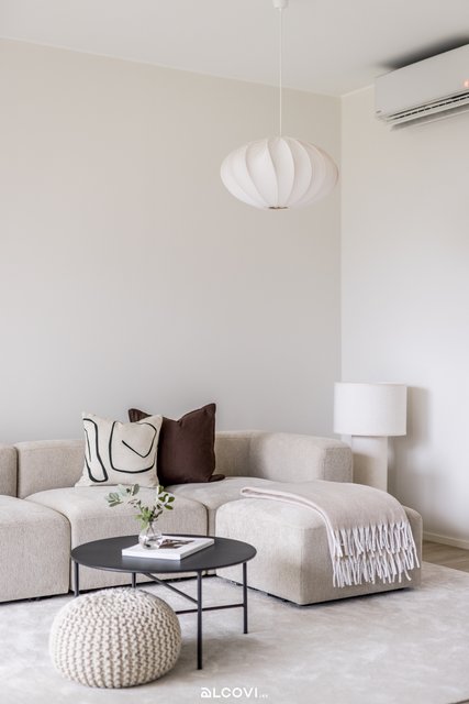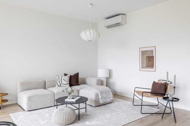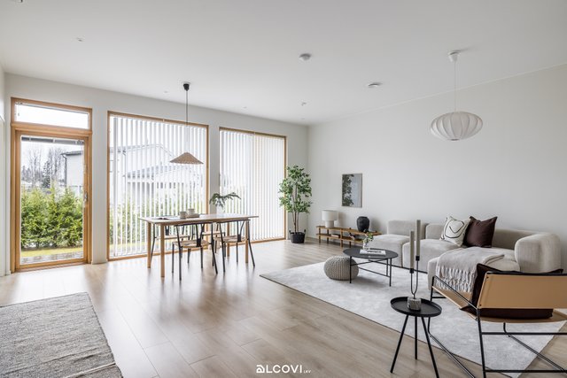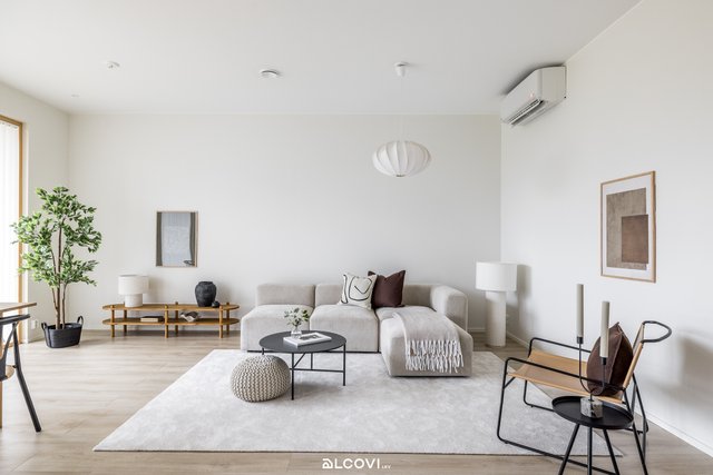 - Olohuoneen lattia on laminaattia (Trendy Pro Beige Oak), seinät maalatut. Ilmalämpöpumpun sisäyksikkö. Kulku terassille. Lattialämmitys (vesikiertoinen).